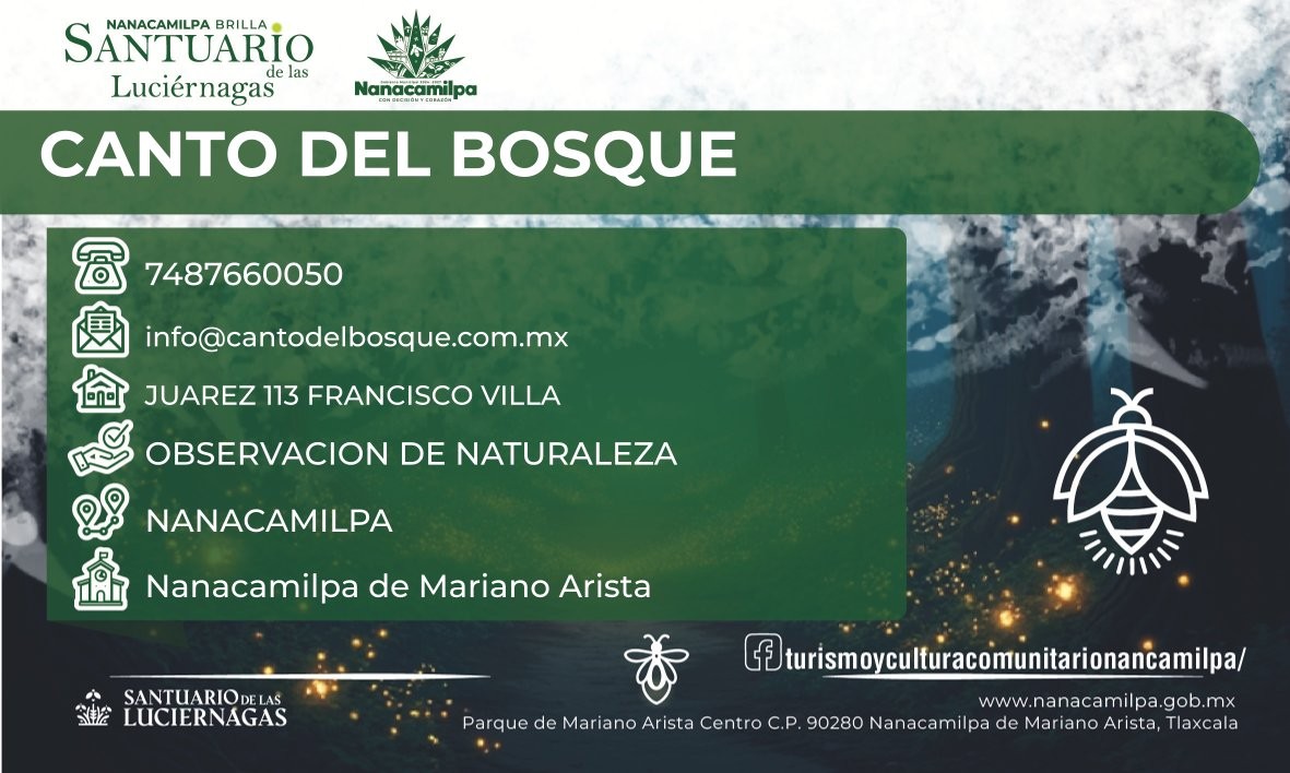 En esta sección encontrarás una muestra representativa de los servicios que hacen de Nanacamilpa un destino único: desde Artesanos locales, con sus obras llenas de identidad, hasta experiencias inolvidables como el Avistamiento de luciérnagas. Disfruta de nuestra Gastronomía, conoce nuestras Haciendas históricas, descansa en nuestros Hoteles, saborea los productos del Maguey y los Hongos, y conecta con la naturaleza a través de nuestras Touroperadoras. Aquí encontrarás información útil como ubicaciones, redes sociales y teléfonos de contacto. Todo acompañado de la calidez y hospitalidad de nuestra gente. NANACAMILPA UN LUGAR QUE ILUMINA AL MUNDO